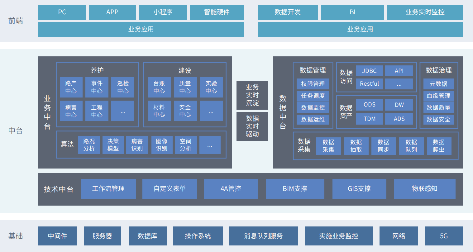 智慧公路數字中臺以“業(yè)務+數據”雙中臺為核心技術,面向公路管理部門及運營企業(yè)打造一站式中臺解決方案。涵蓋業(yè)務中臺、數據中臺、技術中臺等多個領域,旨在通過新一代數字化、智能化技術,輸出本地化中臺產品,助力公路管理部門及運營企業(yè)構建公路產業(yè)生態(tài)圈,幫助政府、企業(yè)實現高質量的數字化轉型。