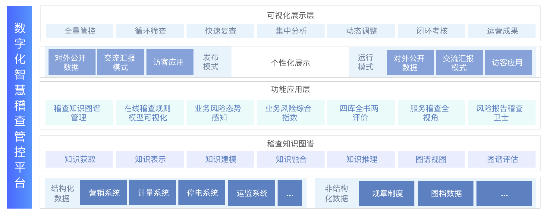 采用自然語言處理技術(shù)、知識圖譜技術(shù)結(jié)合數(shù)據(jù)挖掘技術(shù),對營銷、計量等系統(tǒng)中的結(jié)構(gòu)化數(shù)據(jù)及稽 查業(yè)務(wù)知識等非結(jié)構(gòu)化數(shù)據(jù)進行圖譜構(gòu)建及數(shù)據(jù)建模,構(gòu)建事前預防、事中處置、事后分析的風險管控體系,實現(xiàn)稽查知識圖管理、在線稽查規(guī)則模型可視化、業(yè)務(wù)風險態(tài)勢主動感知、業(yè)務(wù)風險綜合指數(shù)、業(yè)務(wù)風險預警推送、四庫全書兩評價、服務(wù)查全視角、風險報告稽查衛(wèi)士等功能,基于L2智慧稽查,全面構(gòu)建“網(wǎng)、線、點”立體化稽查網(wǎng),有效防范稽查業(yè)務(wù)風險,提高稽查人員工作效率及 能力。