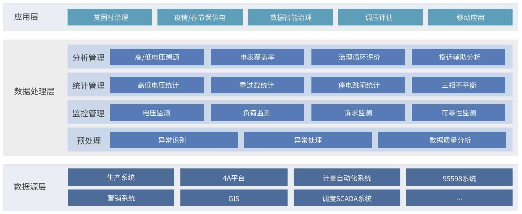 生產(chǎn)監(jiān)測(cè)解決方案是開展電壓質(zhì)量管理的監(jiān)控指揮系統(tǒng),系統(tǒng)融合營(yíng)銷、客服、生產(chǎn)、GIS、計(jì)量、調(diào)度等系統(tǒng)數(shù)據(jù),完成千萬級(jí)測(cè)點(diǎn)數(shù)據(jù)的快速的清洗、計(jì)算、分析和應(yīng)用,建立電能質(zhì)量“采集-監(jiān)測(cè)-分析-治理-評(píng)價(jià)”的閉環(huán)管控機(jī)制,構(gòu)建“站-線-變-戶”一體化數(shù)據(jù)模型,擴(kuò)大居民用戶電壓監(jiān)測(cè)范圍,挖掘智能電表數(shù)據(jù)應(yīng)用場(chǎng)景,綜合利用智能電表、電壓監(jiān)測(cè)儀、負(fù)控終端等多源數(shù)據(jù),分析可能存在或潛在高低電壓、重過載問題的變電站、母線、中壓線路和配電臺(tái)區(qū),梳理問題清單,對(duì)問題進(jìn)行溯源,輔助精準(zhǔn)運(yùn)維。