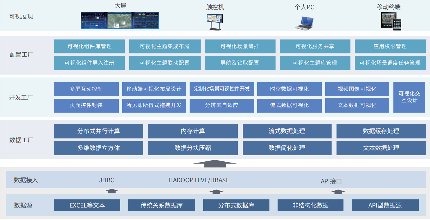 針對各行業(yè)的各種展現(xiàn)場景進(jìn)行快速可視化的套裝軟件,以簡潔式操作和配置為主,可針對突發(fā)業(yè)務(wù) 展現(xiàn)需求進(jìn)行及時構(gòu)建和響應(yīng)。平臺的使用無需專業(yè)技術(shù)人員介入,可完全面向業(yè)務(wù)人員,通過簡單的 自助拖拽實(shí)現(xiàn)展現(xiàn)效果的呈現(xiàn),便于以業(yè)務(wù)需求為主導(dǎo)的方式進(jìn)行業(yè)務(wù)數(shù)據(jù)的自主探索。該平臺提供豐富的可視化展現(xiàn)方式,支持多尺寸終端的自動適配,以最大程度降低使用人員的技術(shù)門檻,解放業(yè)務(wù)人 員專心解決業(yè)務(wù)問題、探索業(yè)務(wù)規(guī)律。