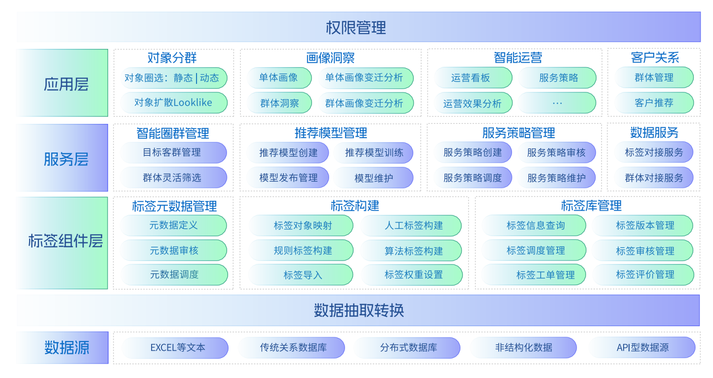 支持多種標(biāo)簽的一站式構(gòu)建方式,人機(jī)協(xié)同完成客戶360°標(biāo)簽體系;并對(duì)外提供多種方式的標(biāo)簽、畫像、用戶&業(yè)務(wù)數(shù)據(jù)的數(shù)據(jù)共享服務(wù)。