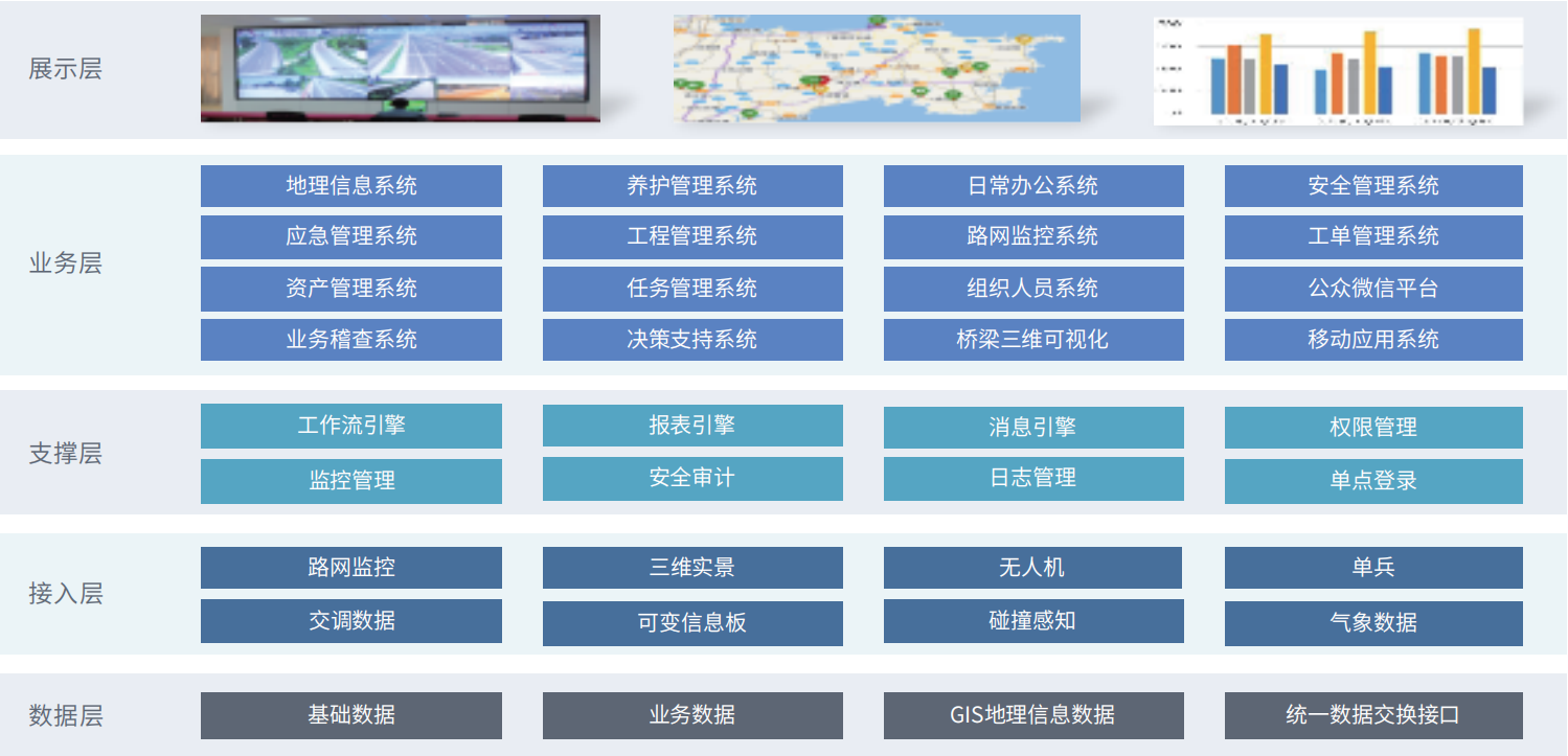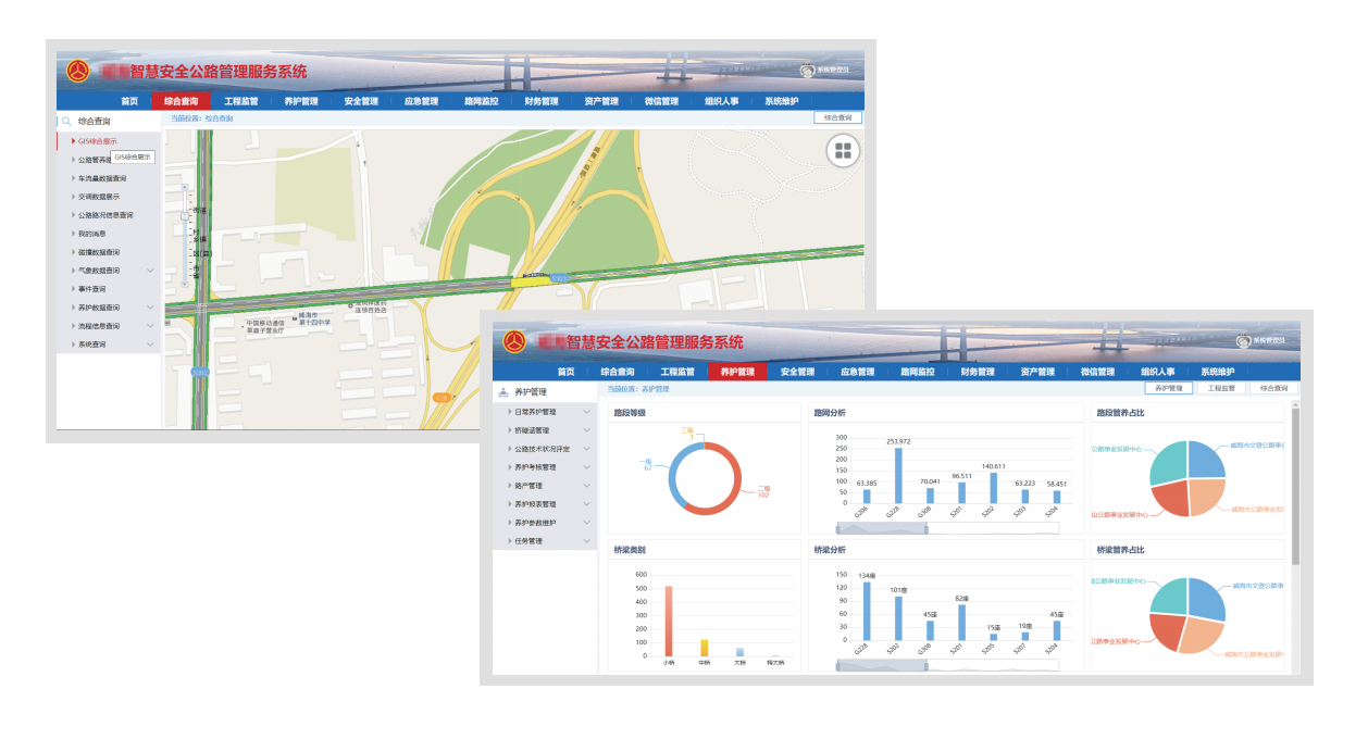 智慧安全公路管理服務系統(tǒng)以“統(tǒng)一組織、統(tǒng)一設計、跨部門協(xié)同”為指導思想,以路政管理、養(yǎng)護管理、應急指揮管理、費用征收和統(tǒng)一的行業(yè)標準規(guī)范體系為基礎,集成相關應用工具和軟硬件系統(tǒng),讓管理更加準確、高效、規(guī)范、可控,實現人、財、物一體化精確管理。