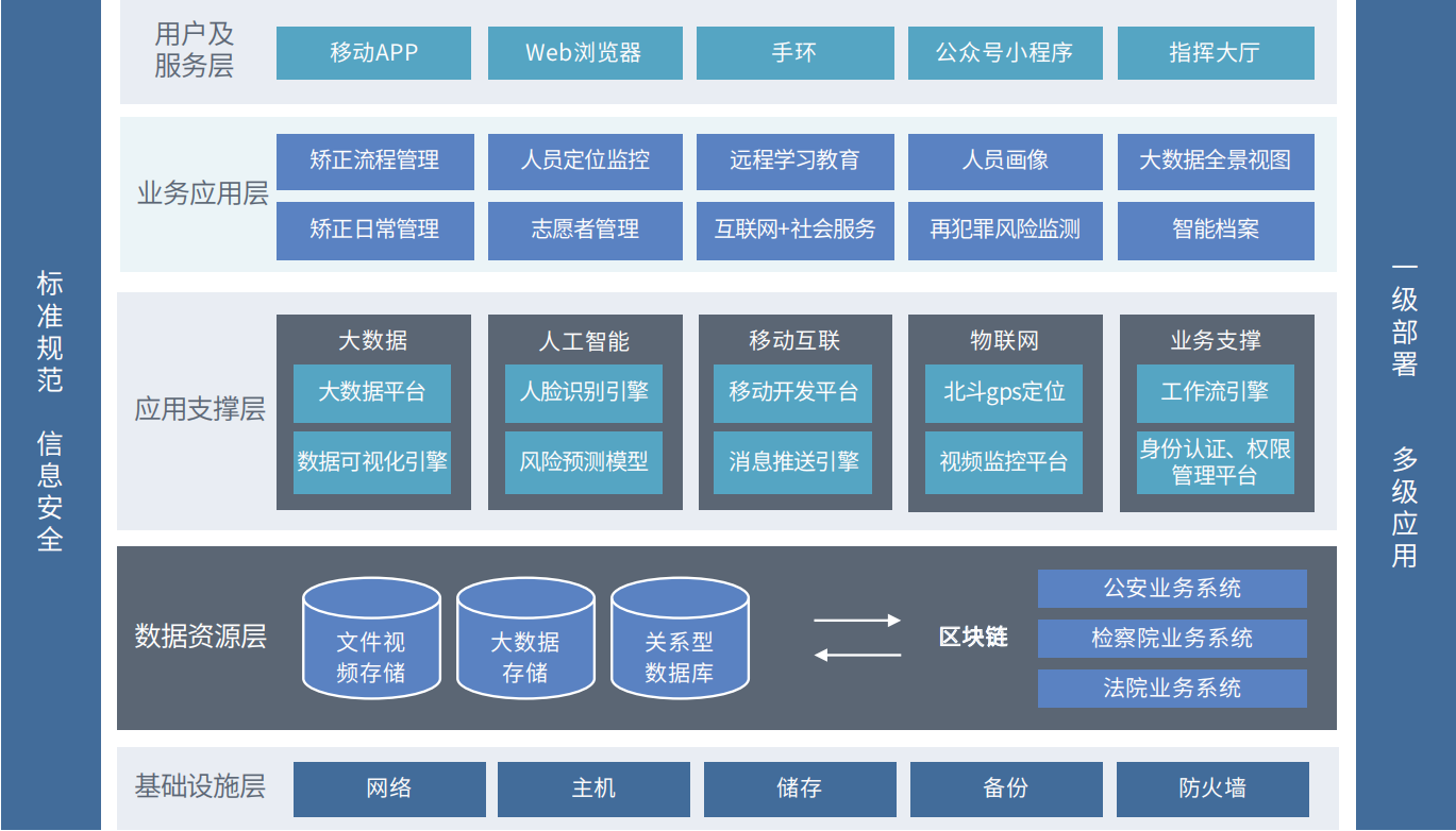 司法智慧矯正平臺(tái)依據(jù)司法部“一個(gè)平臺(tái)、 兩個(gè)中心、三大體系、四個(gè)智慧化融合”指導(dǎo)思想建設(shè),涵蓋社區(qū)矯正一體化大平臺(tái)(工作人員PC端、工作人員移動(dòng)端、矯正對(duì)象移動(dòng)端、社會(huì)力量移動(dòng)端)、數(shù)據(jù)中心、指揮中心等。建設(shè)過程中,嚴(yán)格按照司法部安全規(guī)范、運(yùn)維規(guī)范、基礎(chǔ)規(guī)范、業(yè)務(wù)規(guī)范、技術(shù)規(guī)范,充分融合AI(人工智能)、大數(shù)據(jù)分析技術(shù)、移動(dòng)互聯(lián)技術(shù)、物聯(lián)網(wǎng)技術(shù),打造集業(yè)務(wù)管理、移動(dòng)執(zhí)法、指揮調(diào)度、輔助決策、應(yīng)急處置等功能于一體的社區(qū)矯正全智能化體系,以數(shù)據(jù)一體 化 、管理智能化 、移動(dòng)互聯(lián)化、指揮可視化為目標(biāo),構(gòu)建社區(qū)矯正信息化新格局,實(shí)現(xiàn)現(xiàn)代信息技術(shù)與社區(qū)矯正業(yè)務(wù)全流程智能深度融合。