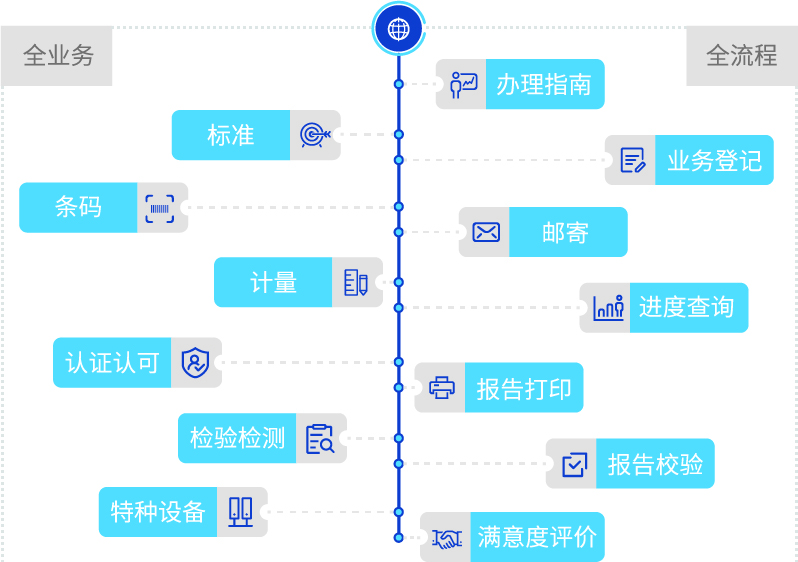通過建立業(yè)務(wù)登記、預(yù)約服務(wù)、進(jìn)度查詢、網(wǎng)上收費(fèi)、報告打印、物流查詢、滿意度評價等工作流程,實(shí)現(xiàn)計量、檢驗、特種設(shè)備、條碼業(yè)務(wù)的全程網(wǎng)上辦理,標(biāo)準(zhǔn)、認(rèn)證認(rèn)可、知識產(chǎn)權(quán)等業(yè)務(wù)網(wǎng)上轉(zhuǎn)接辦理,滿足企業(yè)便捷高效的服務(wù)需求。