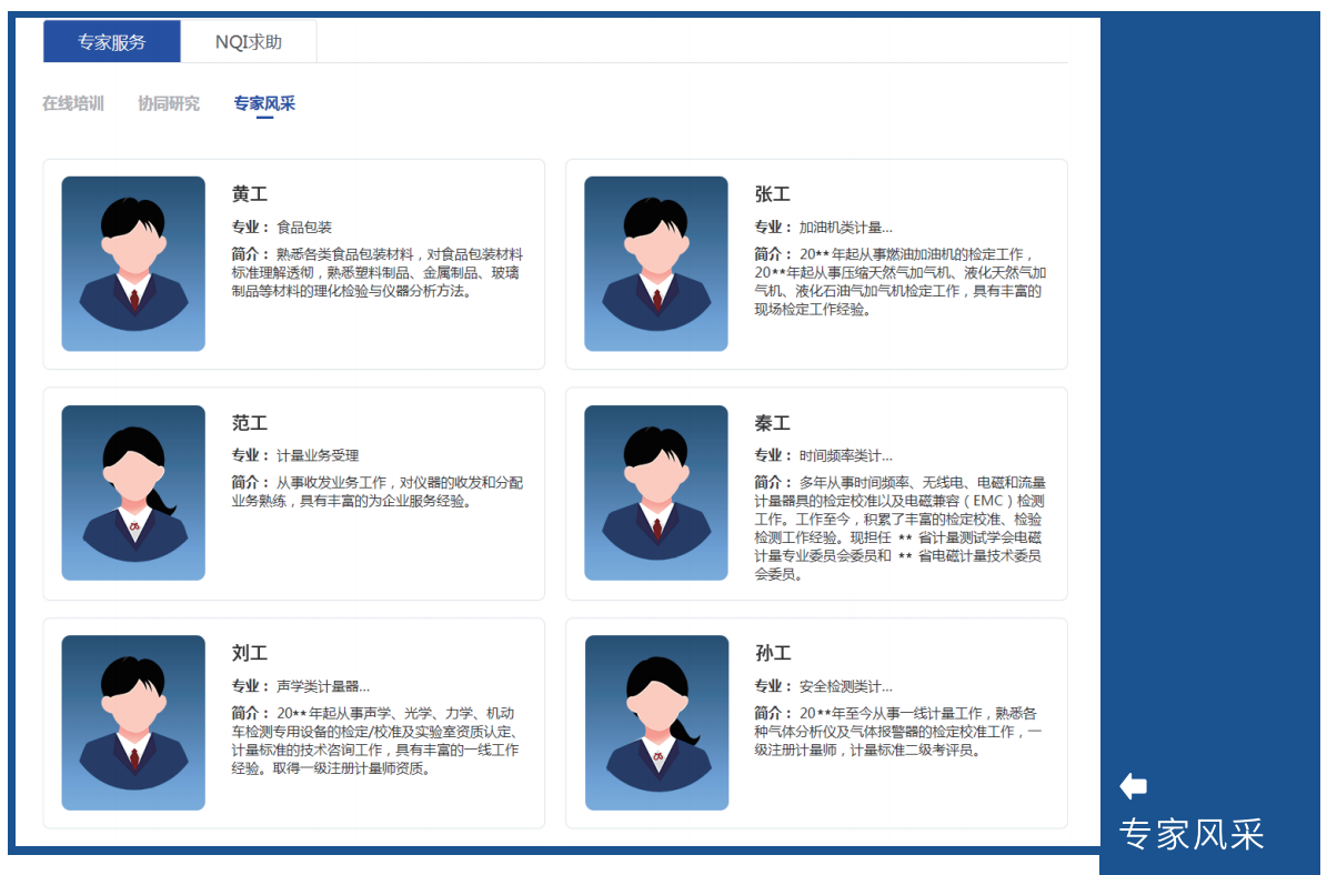 為企業(yè)提供專家服務(wù)和NQI求助。專家服務(wù)方面。企業(yè)可以通過協(xié)同研究、在線培訓(xùn)、在線會議、預(yù)約服務(wù)等多種渠道,實(shí)現(xiàn)與各領(lǐng)域?qū)<业幕?,解決生產(chǎn)經(jīng)營難題。NQI求助方面。分行業(yè)、分領(lǐng)域搭建NQI求助園地,集中大家智慧,解決求助問題。