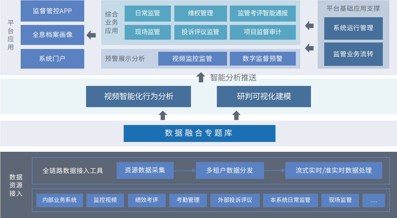 大監(jiān)督一體化管控平臺把“執(zhí)法監(jiān)督、依法行政、內部監(jiān)督”的智能化監(jiān)督作為系統(tǒng)建設的主線,實現檢測預防、提醒自糾、 分析研判、線索倒查和責任追究,從而全面提升監(jiān)督效能。